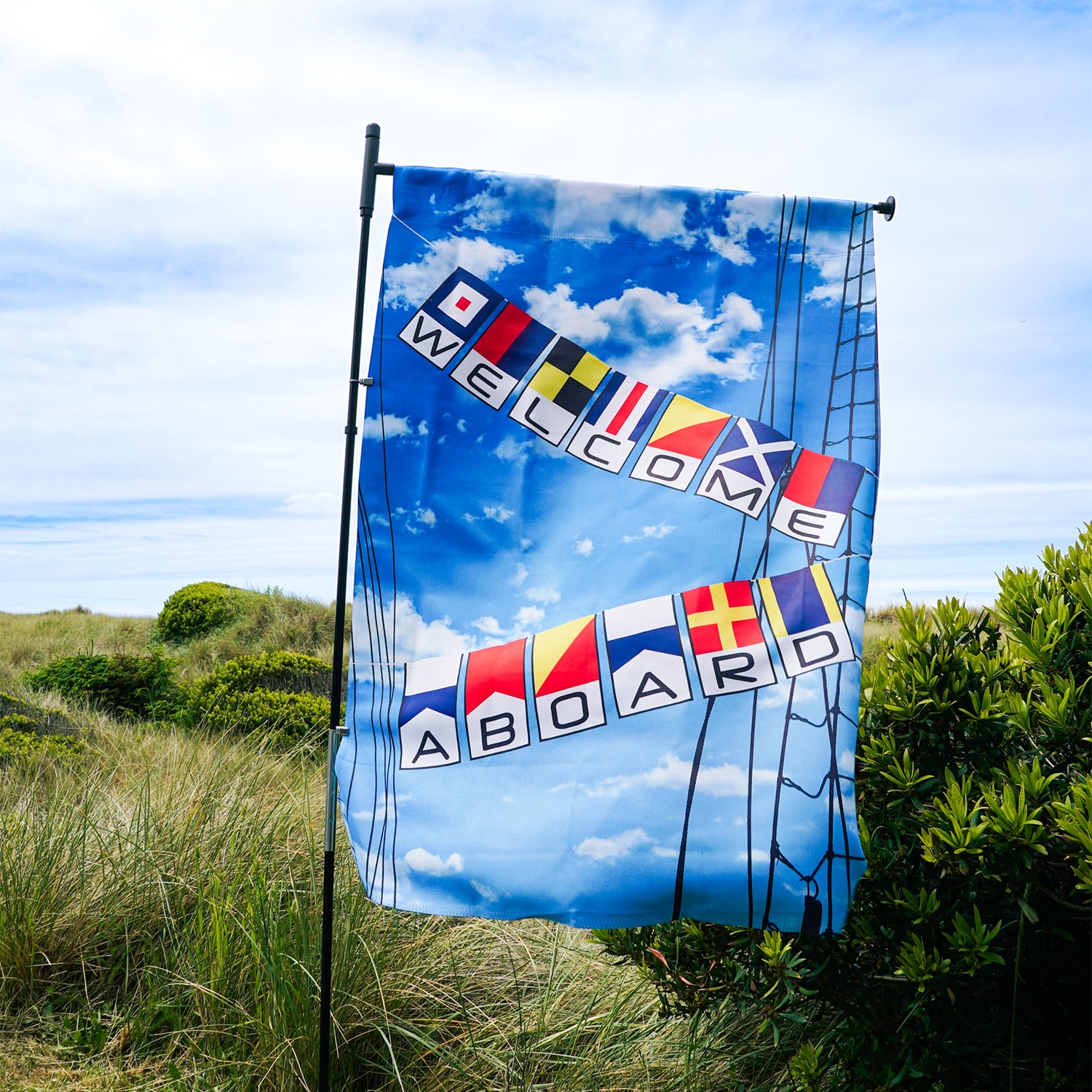 Add that yacht-life style to anywhere you moor your vessel with the Welcome Aboard Lustre House Banner. With detailed, printed graphics that is right reading on both sides, these flags are great for beach houses and beyond. For a limited time get Free Shipping on all USA orders.